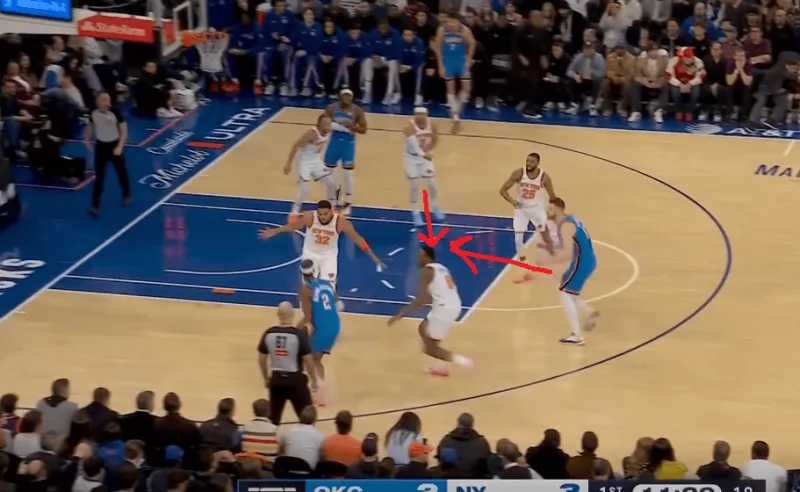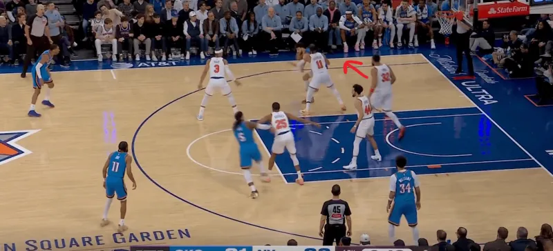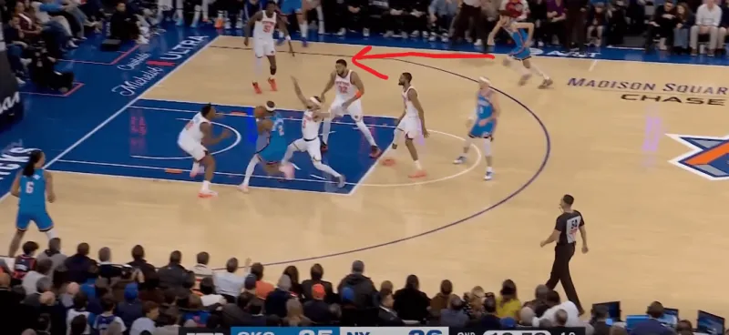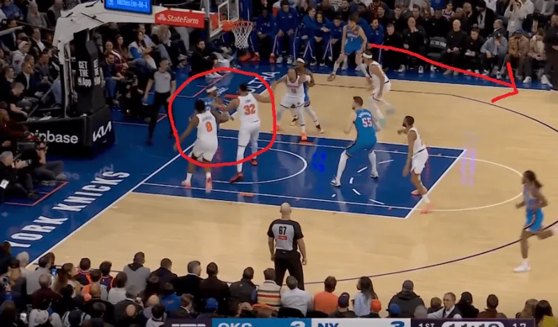 除了切特简单原地接球空位的出手,行进间雷霆也在考验尼克斯保护唐斯下的换防和轮转,在这次转换中布里奇斯对位切特,唐斯迅速回收,