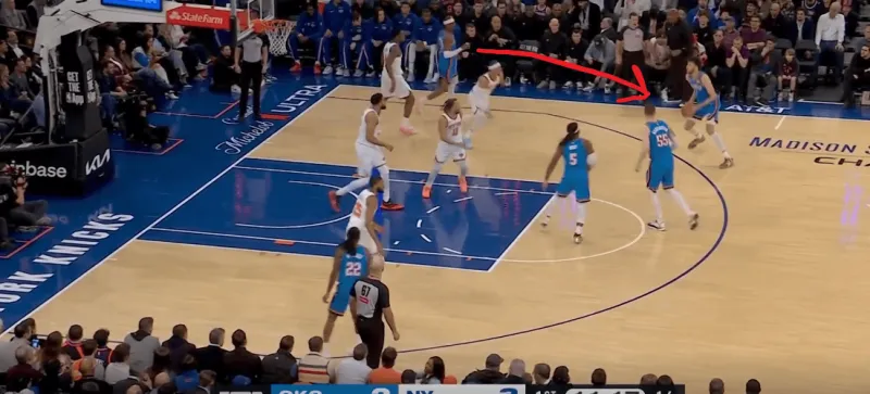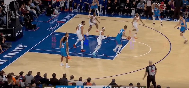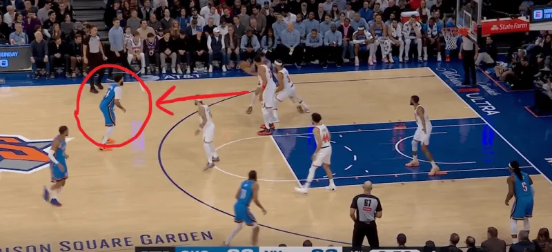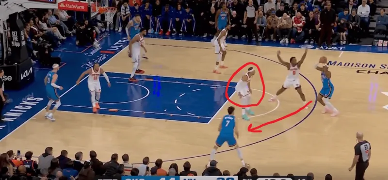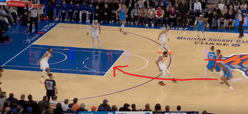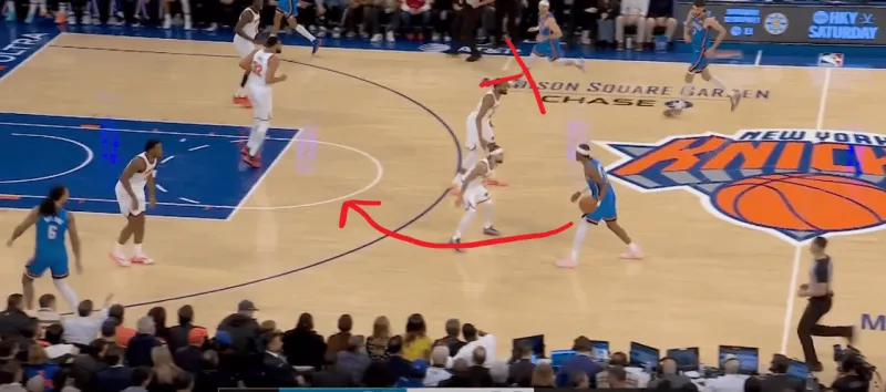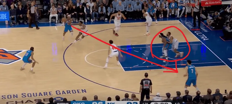 当切特和SGA身处next站位时,利用哈特就近的协防,切特迅速接应SGA惩罚尼克斯对SGA的防守策略: