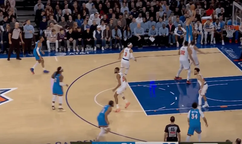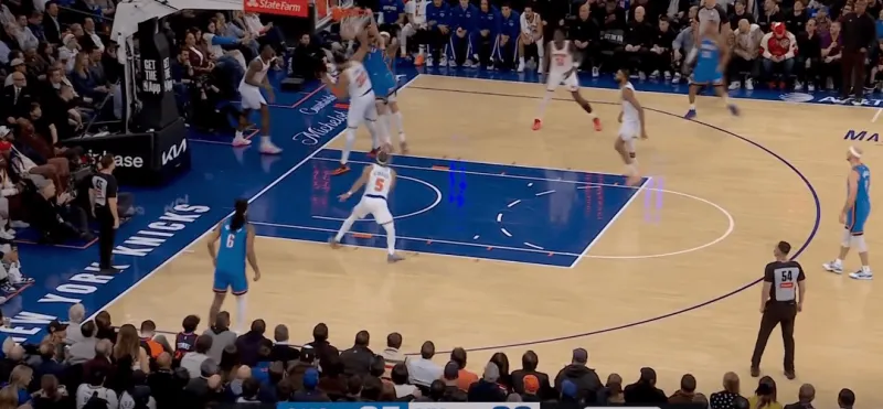 于是切特迅速切入,并利用尼克斯的多人补防SGA,来到禁区完成二次进攻: